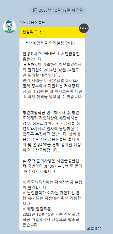 얼마 전 서민금융진흥원으로부터 청년희망적금 만기 도래 관련으로 연락받으신 분들이 계실 텐데요.