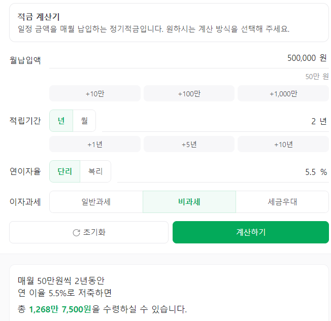 만일, 매달 50만 원씩 금리는 5% 이율에 0.5% 우대금리가 적용된 5.5%로 계산해 보겠습니다.