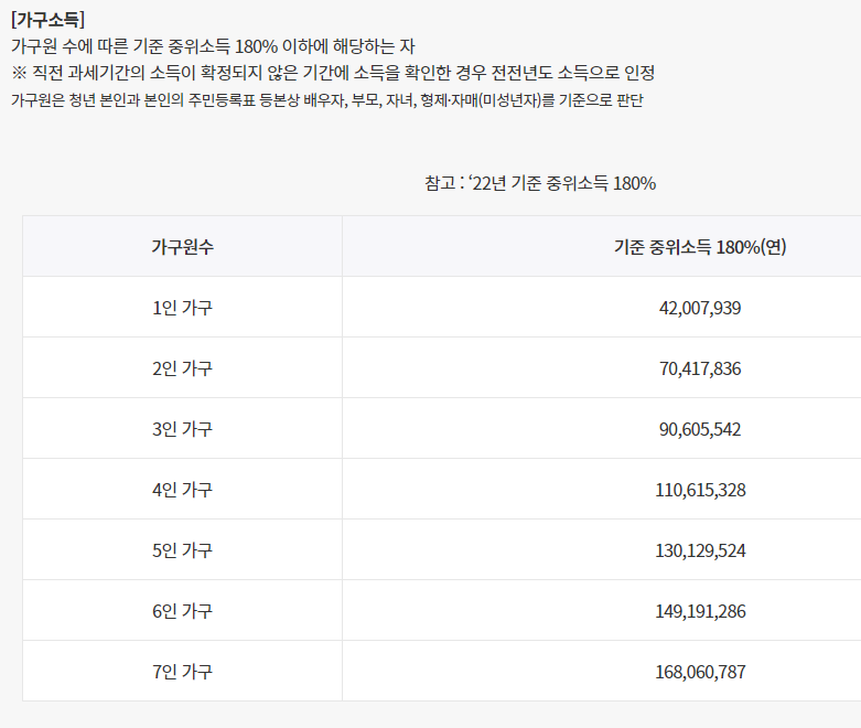 *가구원 수에 따른 기준 중위소득 180% 이하는 1인 가구의 경우 4,200만 원 이하, 2인 가구라면 7,041만 원 이하