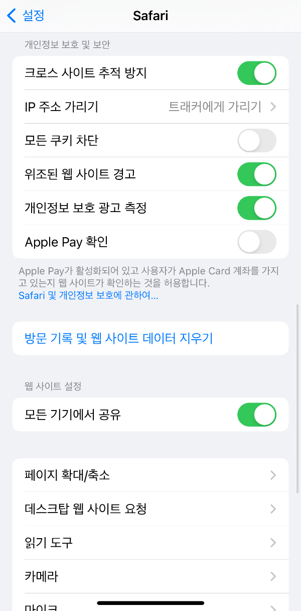 아이폰 설정 - safari(사파리)- 방문 기록 및 웹 사이트 데이터 지우기