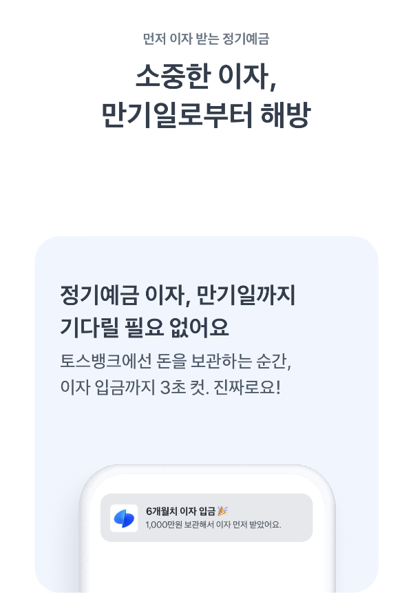 위 글은 토스의 정기예금 상품 중 토스 먼저 이자 받는 정기예금 만들기에 대한 설명으로